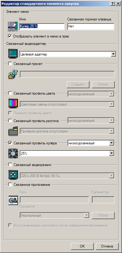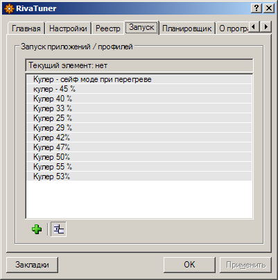 5) Следующий шаг - создание элементов запуска Riva Tuner по управлению кулером. Переходим в закладку "Запуск". На следующем скриншоте вы увидите уже созданные мною элементы :