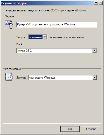 Итаки, вносим задачу автоматизации при старте windows. Я для этих целей выбрал минимальные обороты кулера :