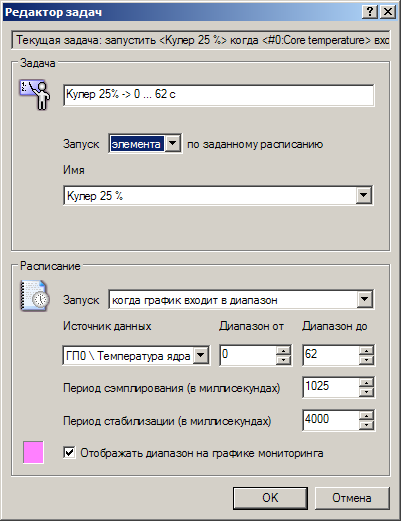 Как вы видите, данные обороты действуют в диапазоне показаний мониторинга Riva Tuner от 0 до 62 градусов. Далее нам необходимо запустить следующую задачу, то есть при превышении 62 градусов мы должны повысить обороты кулера до 29% (в моём примере), что бы, таким образом, охладить видеокарту :