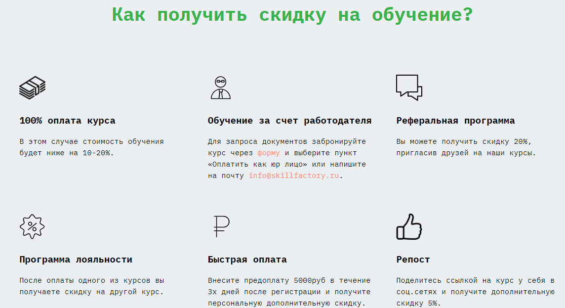 В SkillFactory предусмотрена программа лояльности и несколько других способов получить скидку. При полной оплате курса сразу можно сэкономить 10%-20% от стоимости. Идентичная скидка предусмотрена за приглашение друзей. Также дополнительные скидки можно получить за репост ссылки на курс в социальные сети и внесение предоплаты в размере 5000 рублей.