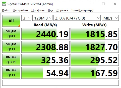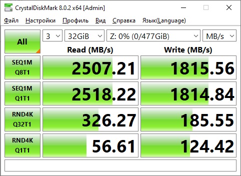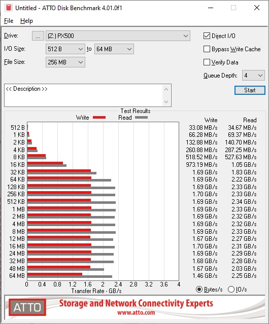 ATTO Disk Benchmark достиг скоростей, которые превосходят заявленные. Запись выше на ~4%, а чтение на ~15%. Обычно этот бенчмарк показывает скорости ниже паспортных, но не в этот раз.