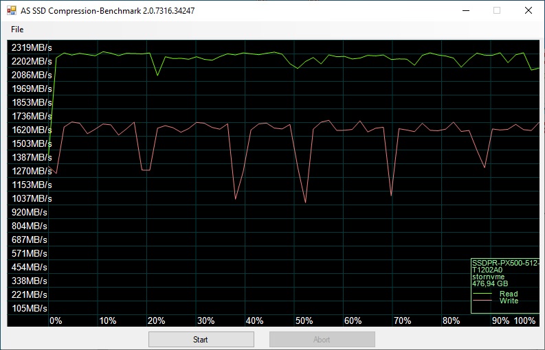 Тест Compression сформировал ровный график чтения. Что касается записи, то график вышел с «пиками» снижения скорости, однако всё в пределах нормы.