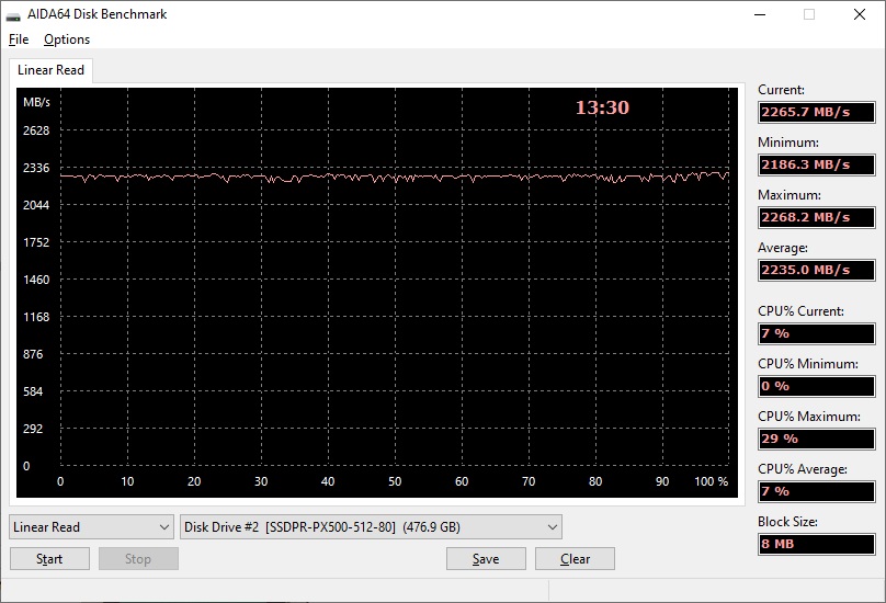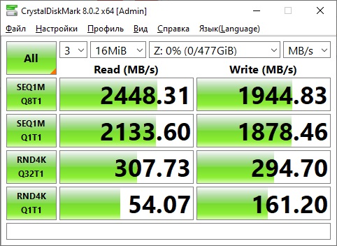 Скорость последовательного чтения радует. Она превосходит заявленную и демонстрирует 2235 МБ/с. Сам график стабильный и ровный.