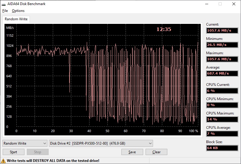 Около 30% объема SSD скорость случайной записи держится на уровне ~950 МБ/с. После чего, график начал скакать, показывая скорость в диапазоне 100 МБ/с - 1000 МБ/с. Предположительно, это связано с рабочими алгоритмами SLC-кэша.