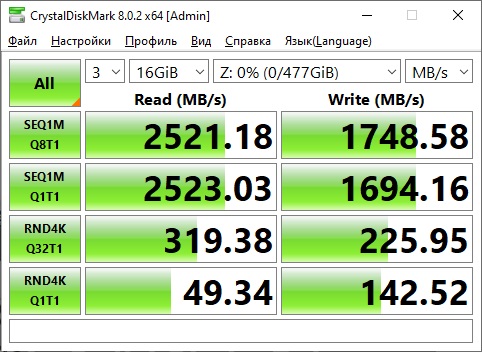 Тест AS SSD Copy создает нагрузку, которая приближена к ежедневным сценариям работы SSD.