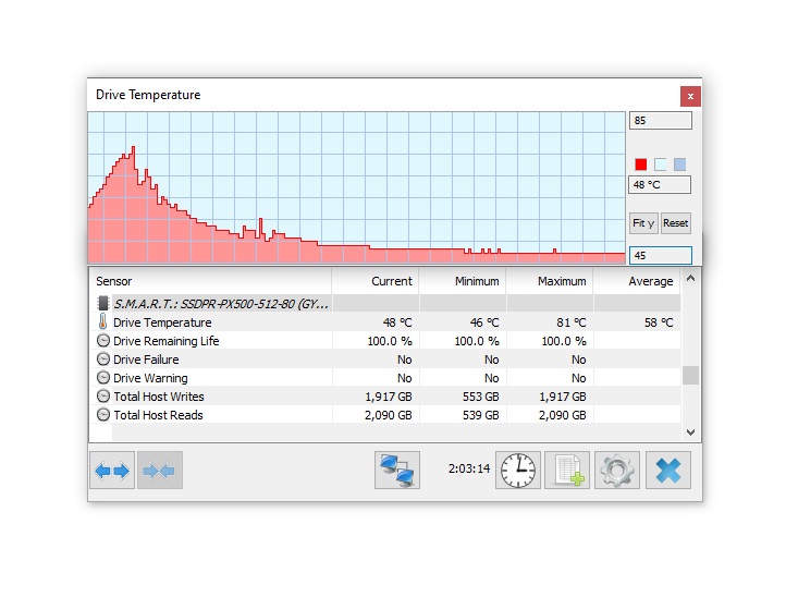 На момент тестовых испытаний температура воздуха в тестовом помещении была 28С. В ходе обычной эксплуатации, без интенсивной работы SSD, температура находилась на уровне 48-50С. Нагрузка бенчмарками кратковременно разогревала PX500 до 78С. Снижение нагрузки сразу же сказывалось на температуре – она быстро опускалась. Напомню, что никакого дополнительного активного обдува накопителя не производилось. В корпусе установлено 2шт 140мм вентилятора (700 об/мин), один на вдув и один на выдув.