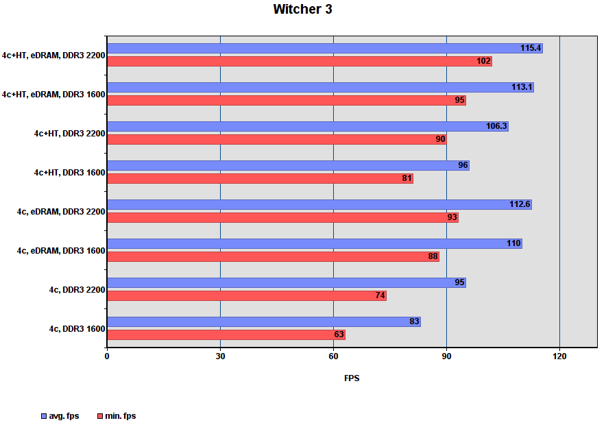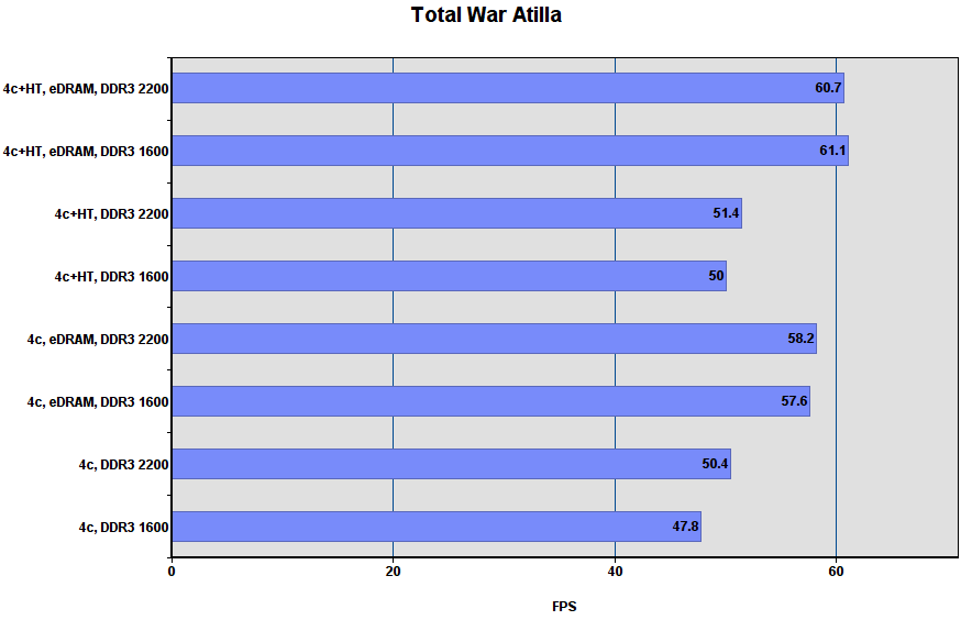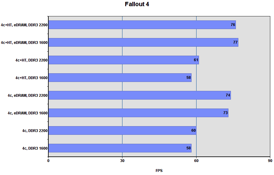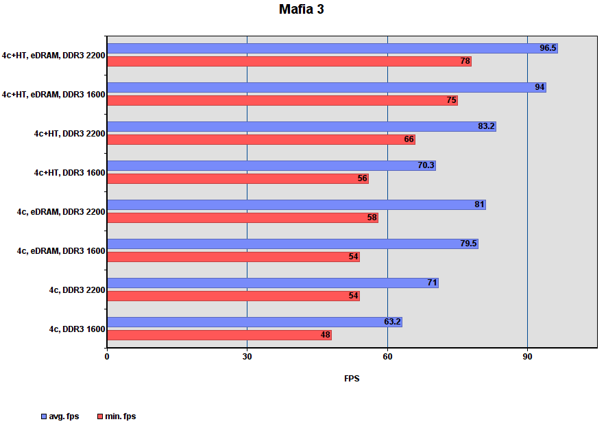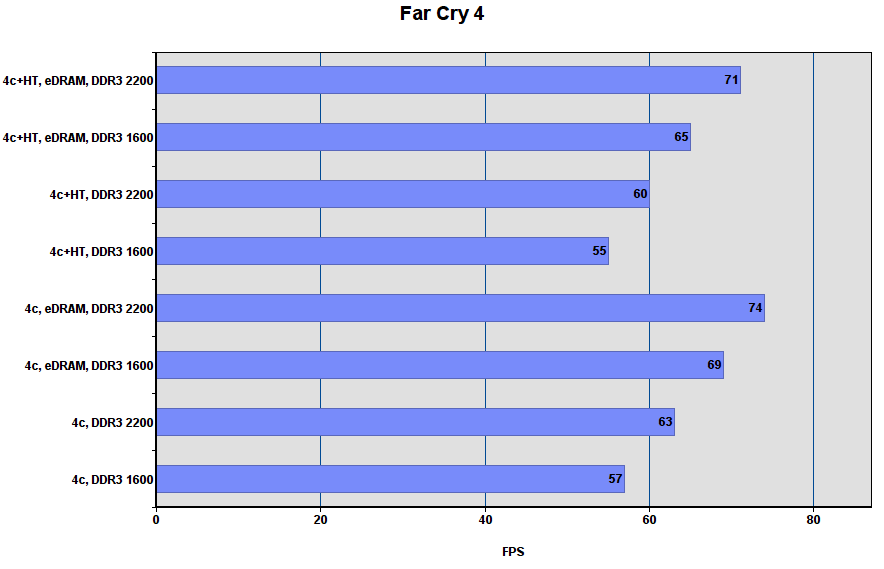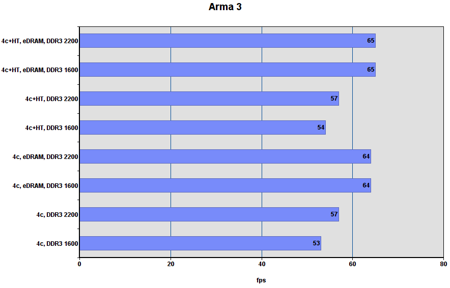 Комментарий: включение eDRAM даёт около 25% прироста. HT и разгон DDR3 слабо влияют на fps.