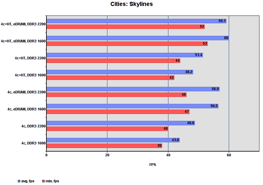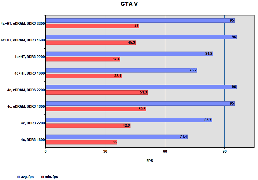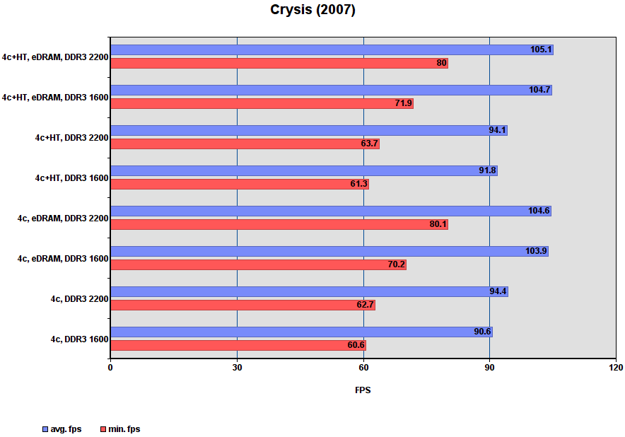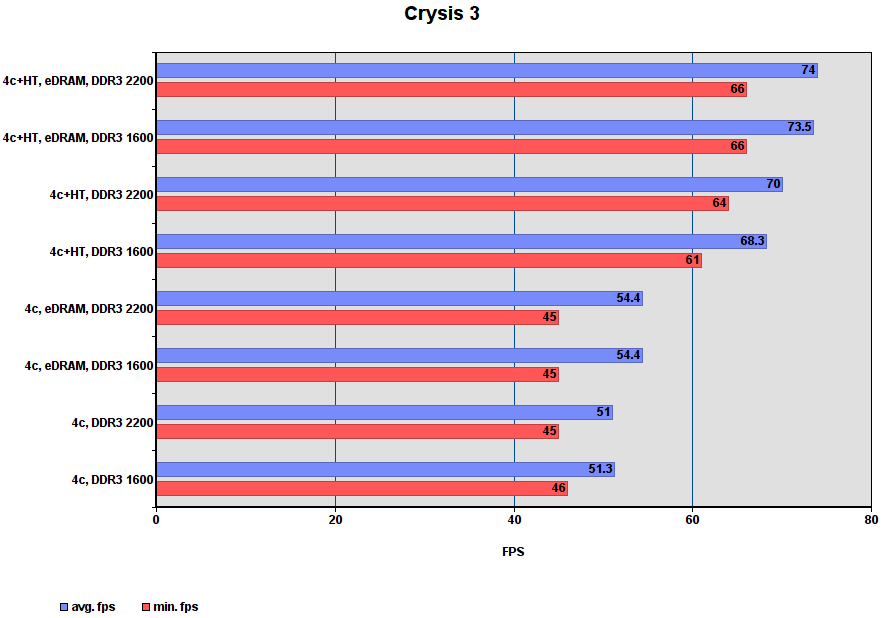 Комментарий: игра больше всего прибавляет от включения eDRAM — для самого слабого режима прирост минимального и среднего fps составил 37%! В режимах без eDRAM?, разгон DDR3 даёт больше чем включение HT.