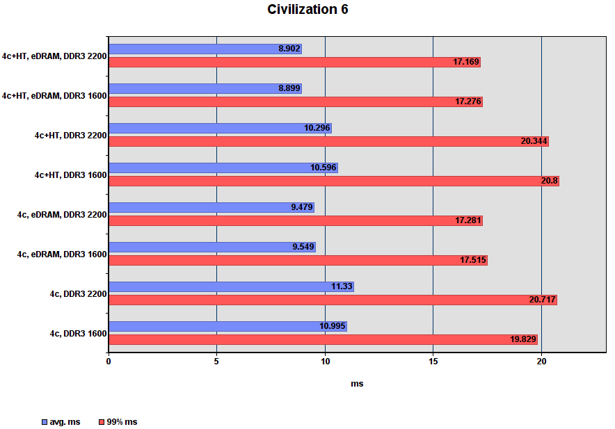 Комментарий: игра безразлична к HT, немного ускоряется от разгона DDR3 и заметно прибавляет от включения eDRAM. В режимах с eDRAM игра перестала реагировать на разгон DDR3 и видимо стала полностью зависеть от вычислительной мощности процессора. Этой игре нужен DX12 или Vulcan...
