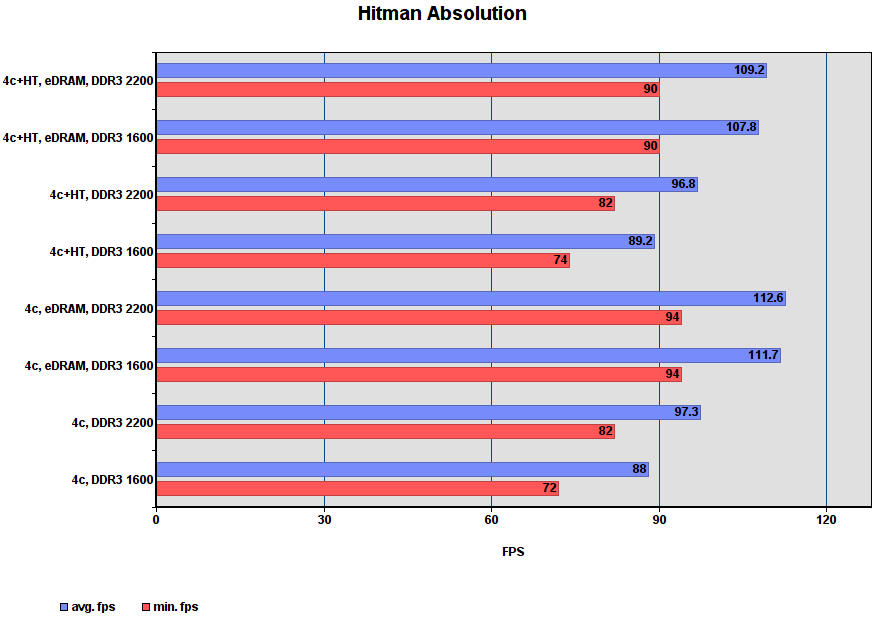 Комментарий: HT и разгон DDR3 в совокупности дают меньшую прибавку fps, чем включение eDRAM.