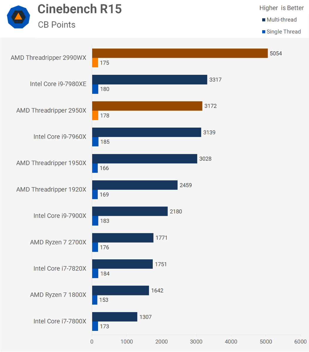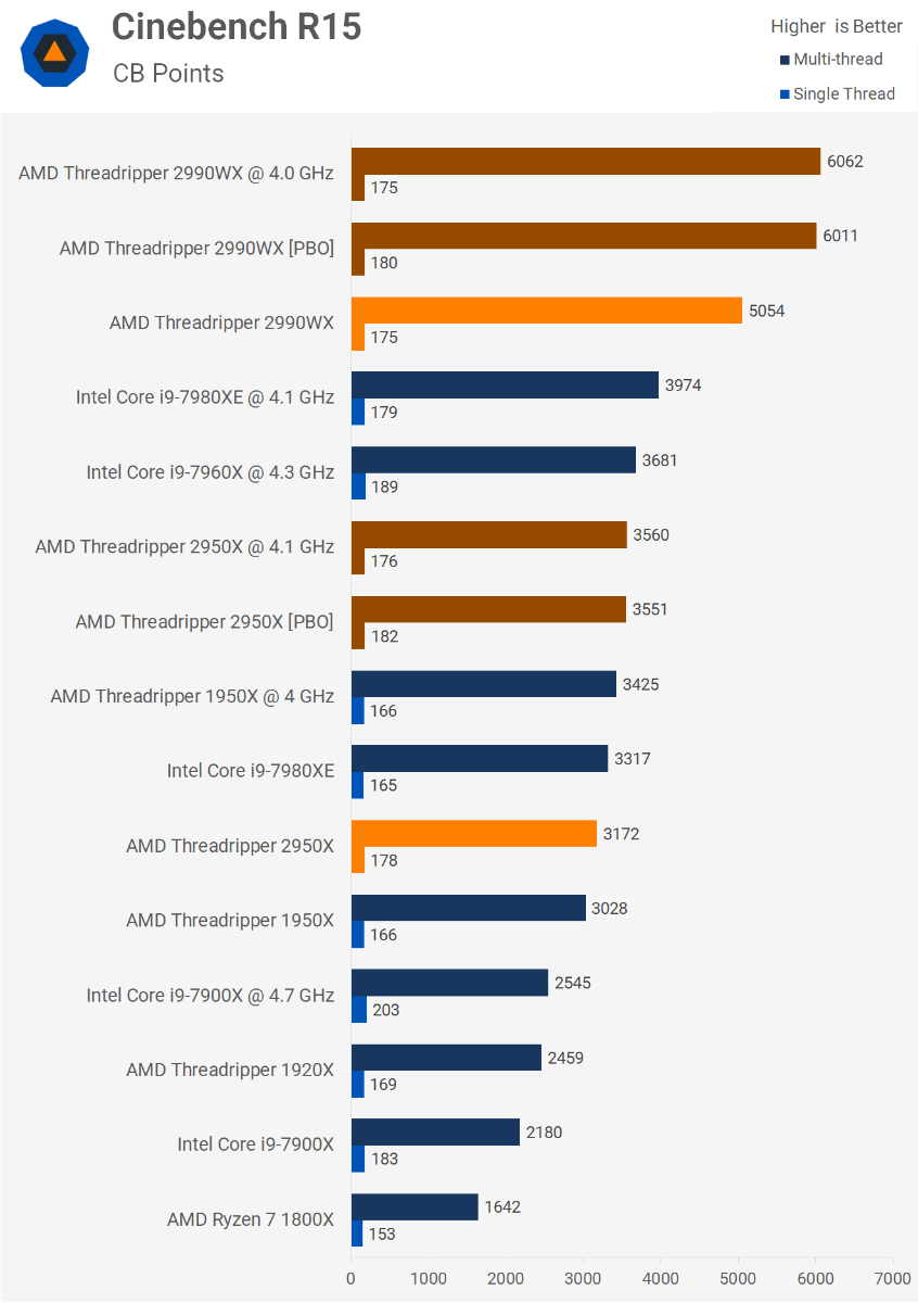 2990WX на 52% превосходит здесь Core i9-7980XE. Можно увидеть в этом недостатки дизайна. 2950X также отлично проявляет себя, хотя преимущество над 1950X всего 5%.