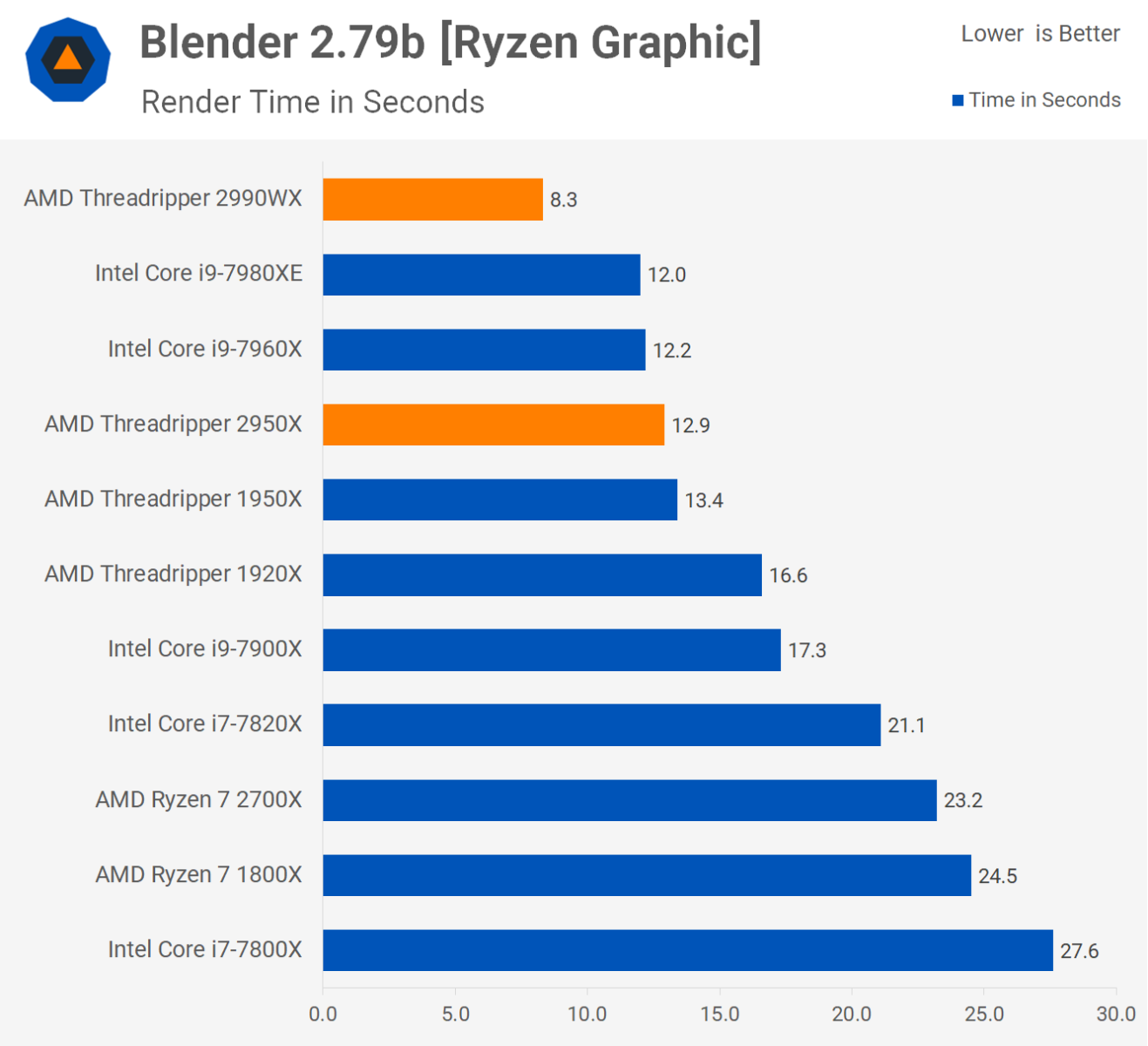 Последний бенчмарк с рендерингом, здесь 2990WX справился хорошо. Времени на обработку потребовалось на 40% меньше по сравнению с 2950X. Это означает, что он быстрее на 65%, процессор Intel отстал на 57%.