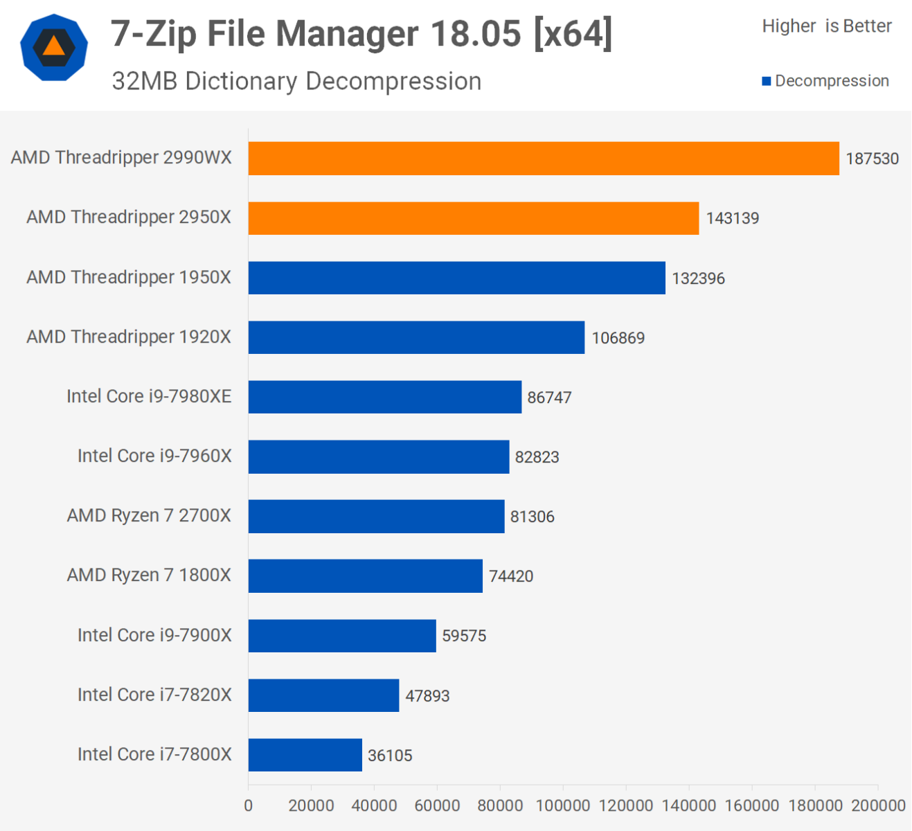 Архитектура AMD Ryzen всегда отлично проявляла себя в деле разархивирования. 2990WX не стал исключением, завершив тест с результатом 187000 MIPS. Однако, это только на 31% быстрее по сравнению с 2950X. Зато скорость сжатия далеко не так хороша.