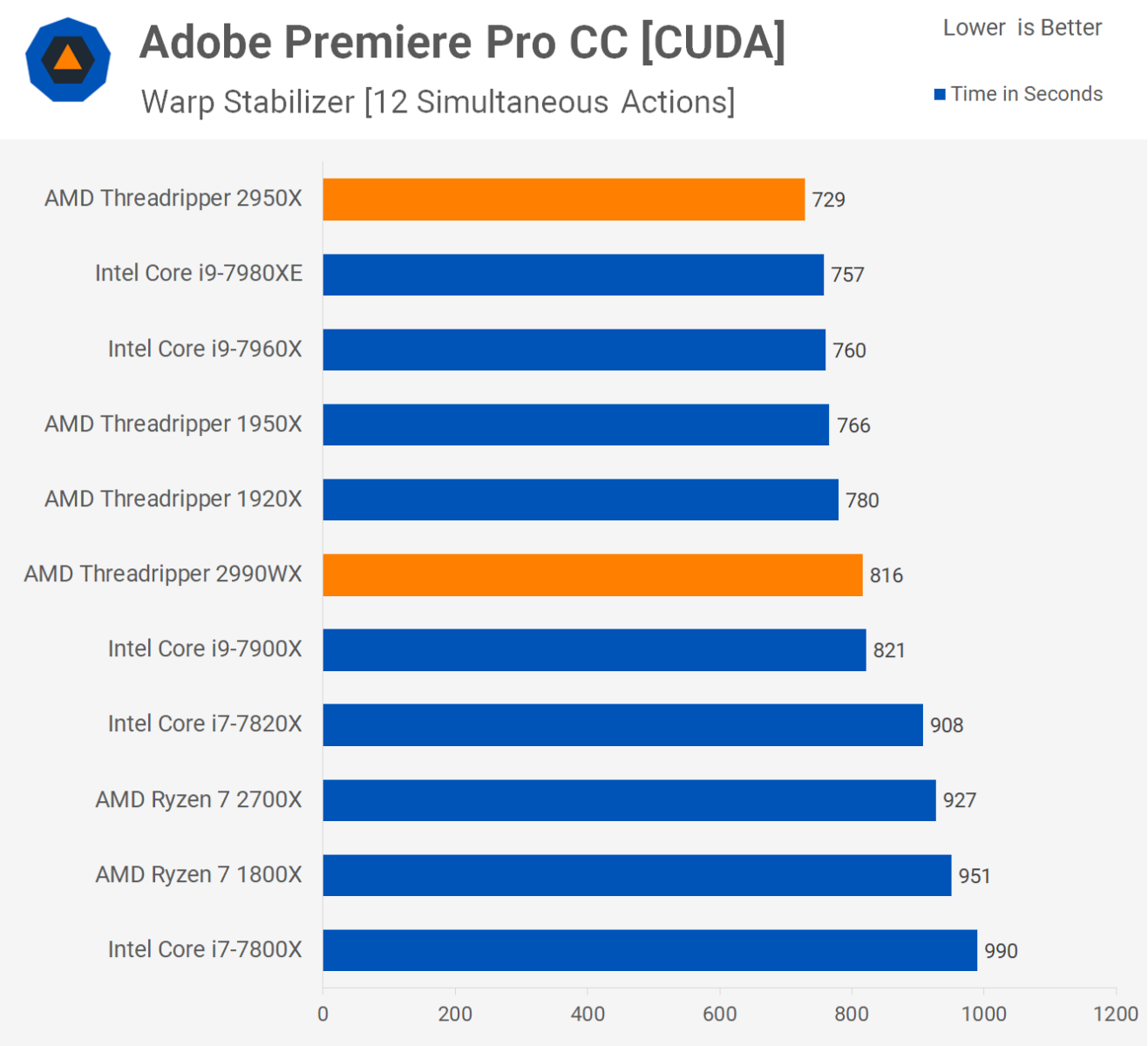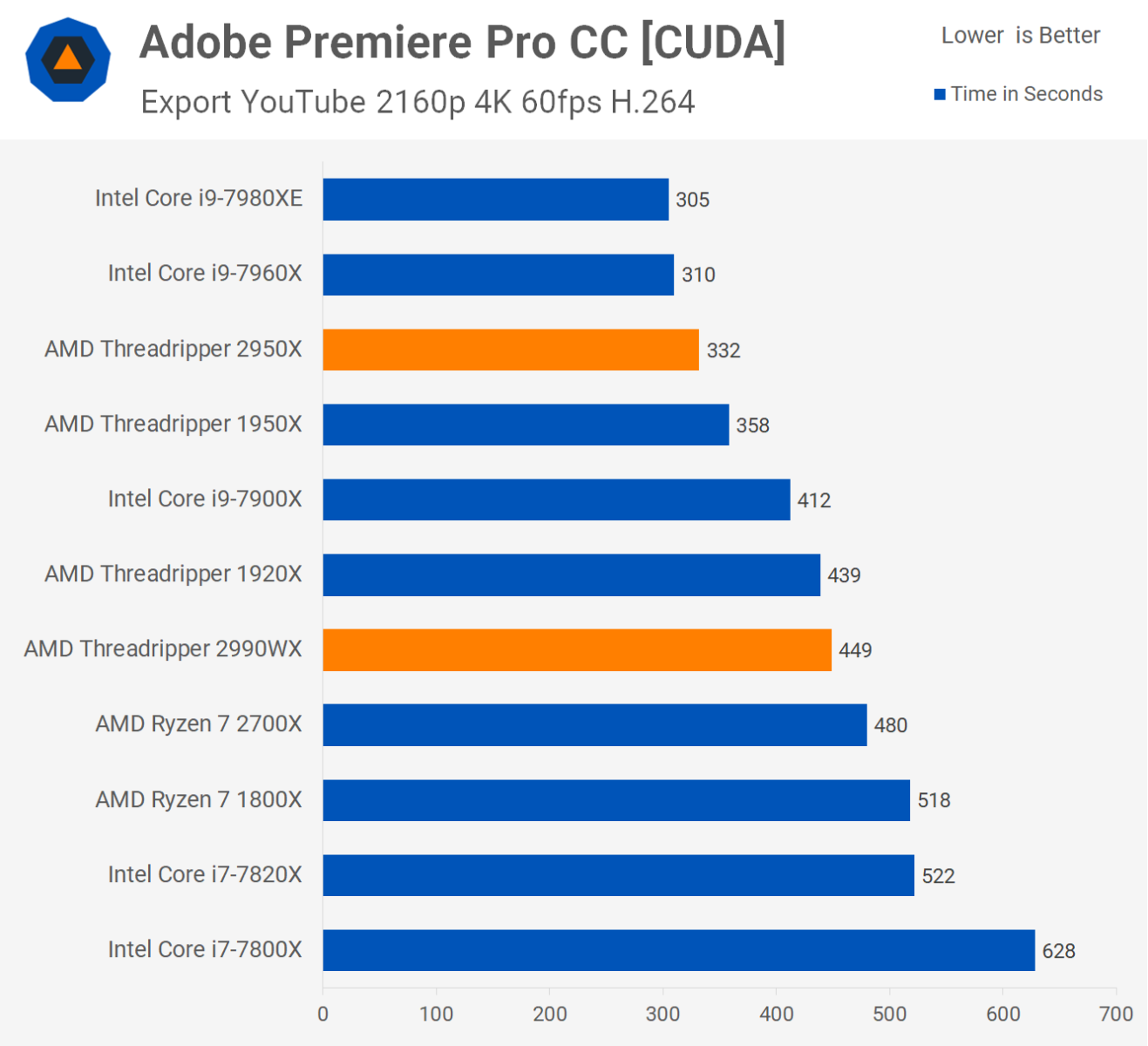 Теперь посмотрим на Adobe Premiere, где 2990WX наглядно проявляет свои возможности в задачах, не связанных с рендерингом.