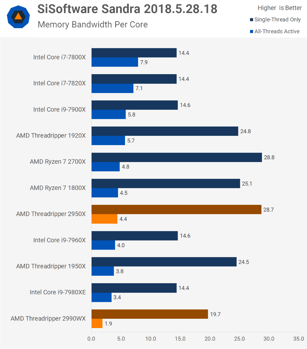 Необходимо смотреть на пропускную способность памяти на одно ядро, а не на весь процессор. С одним активным ядром процессоры Ryzen имеют весьма впечатляющую производительность.