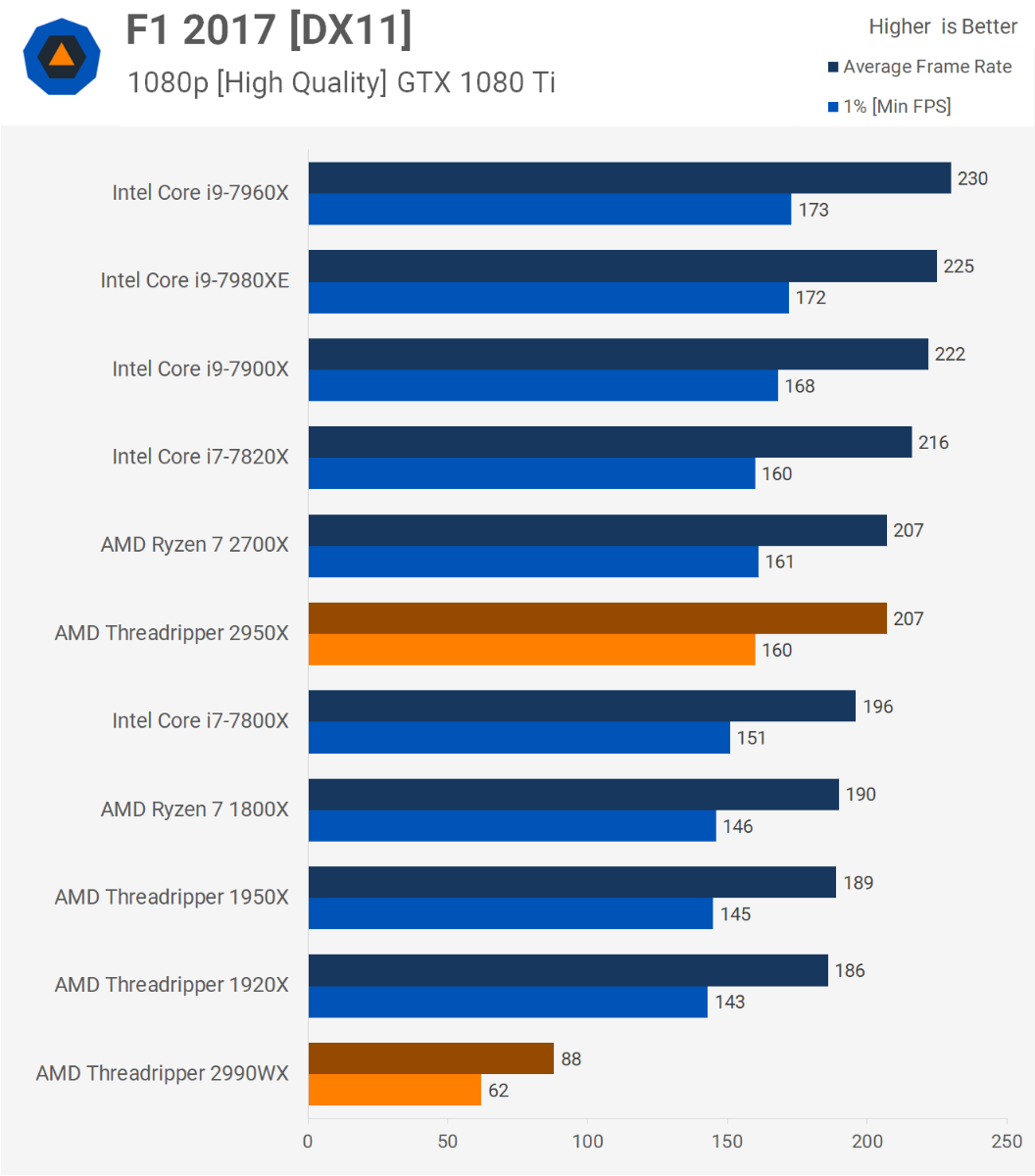F1 даёт такую же картину. 2990WX похож на Pentium, но всё же играть можно без проблем. 2950X находится на уровне 2700X, ненамного уступая более дорогим процессорам Skylake-X.