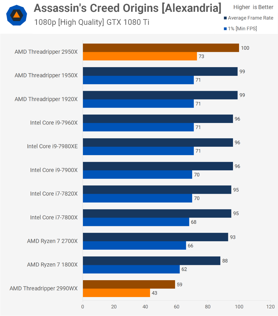 Три процессора Threadripper заняли первые места в игре Assassin's Creed Origins. Они всего на несколько кадров опередили Skylake-X, но победа есть победа. 2990WX10 пал уже ниже отметки в 60 fps.