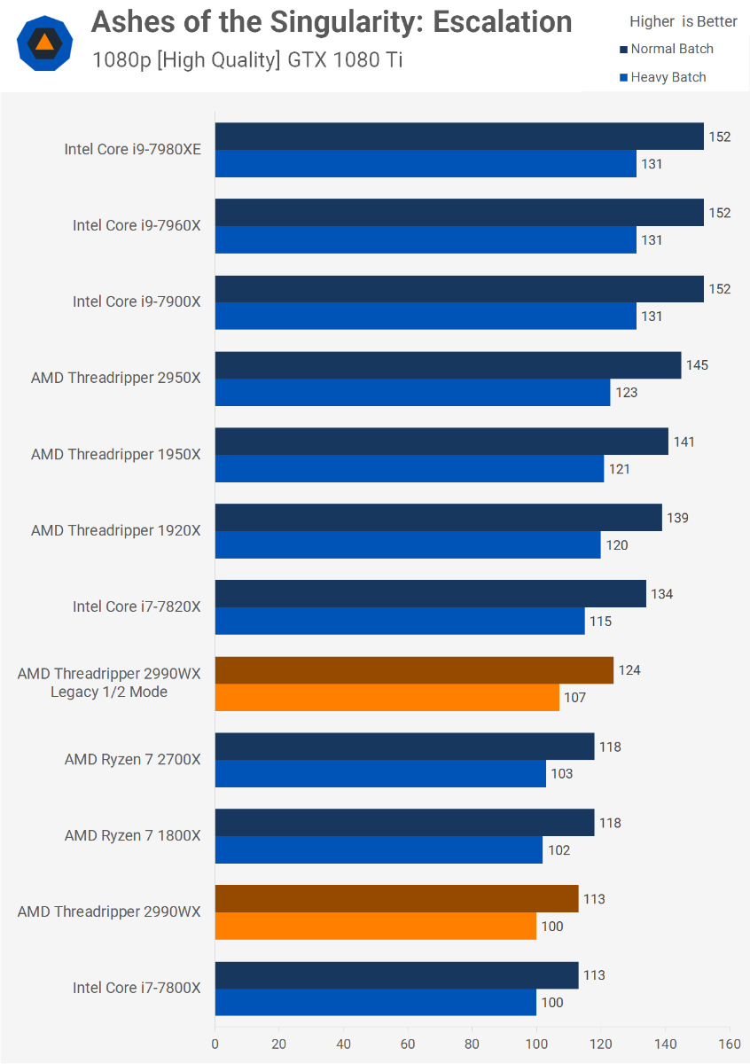 AMD подчёркивала, что 2990WX не является игровым процессором. Компания явно не шутила. Игры испытывают проблемы с эффективным применением 8-ядерным в 2700X, что уж говорить про 32 ядра. Впрочем, результат Ashes of the Singularity нельзя назвать ужасным, хотя он ниже, чем у 2700X.