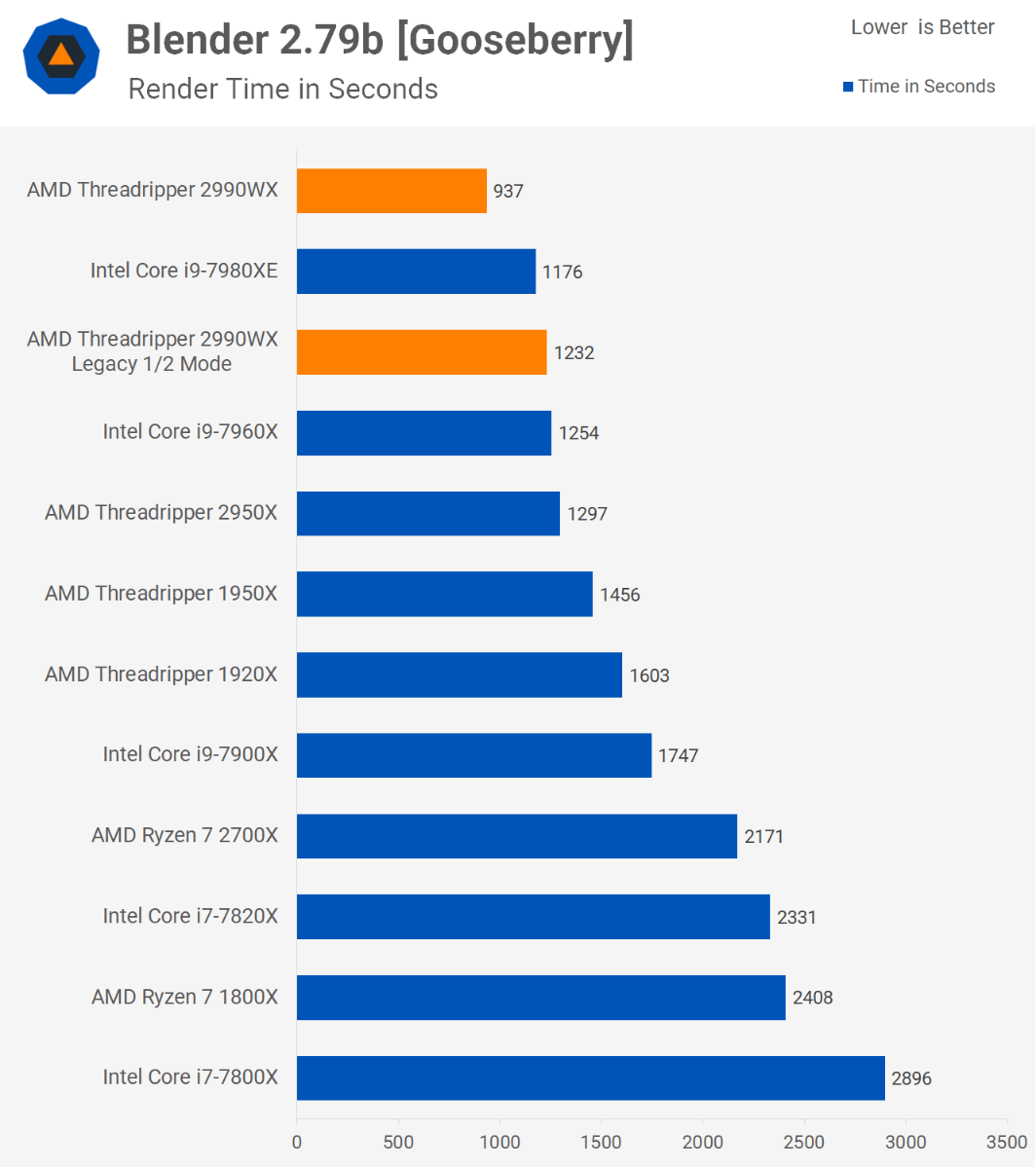 Несмотря на это, должна упасть производительность там, где 2990WX раньше опережал 2950X. Именно это и произошло в Blender.