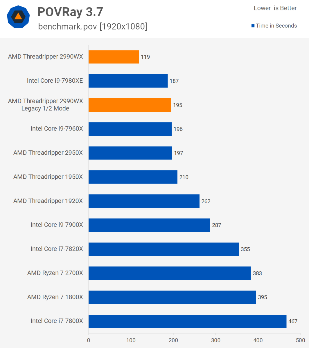 То же самое относится к POVray, где производительность 2990WX на уровне 2950X.