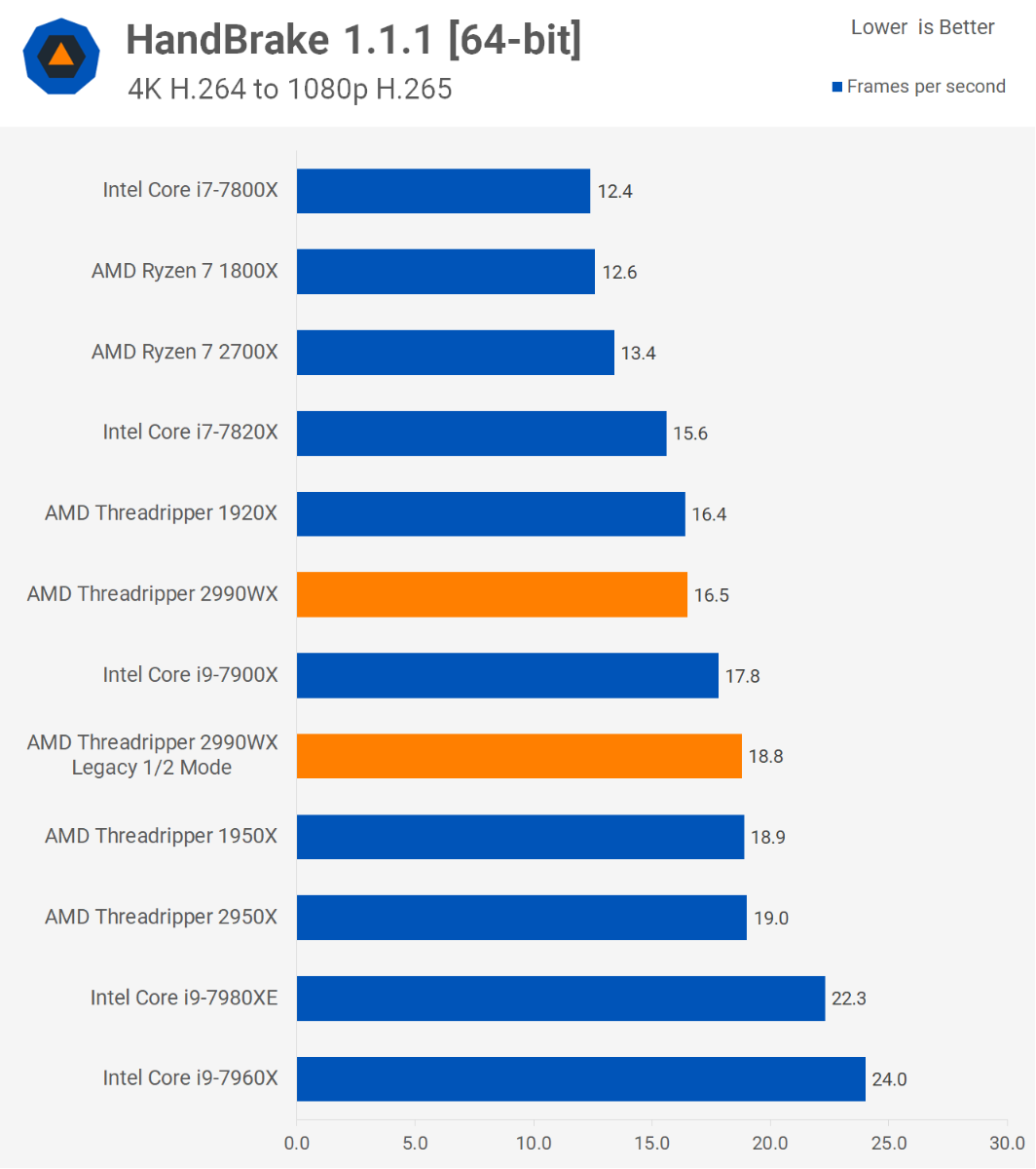 Такая же ситуация наблюдается в HandBrake. Здесь 2990WX задействован далеко не на всю катушку, около 30%. Казалось бы, скорость должна быть сопоставимой с 2950X, но это не так. Последний на 15% быстрее, но не быстрее по сравнению с 1950X. 2990WX находится на уровне 1920X. Ещё один минус.