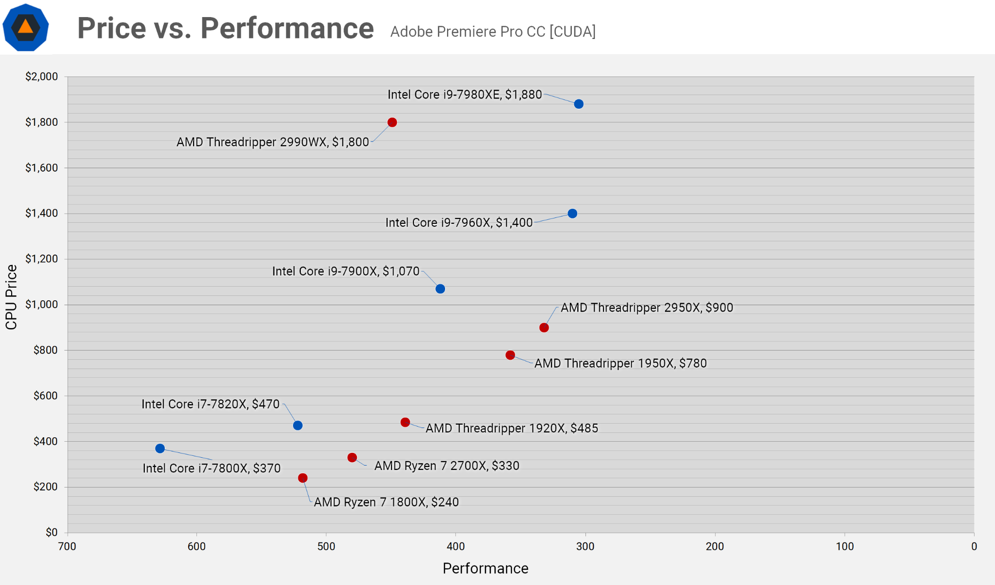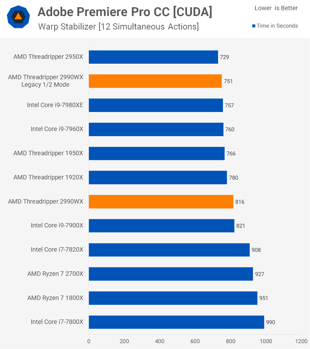 Другим примером является Adobe Premiere Pro CC, хотя 2990WX всё равно отстаёт, но уже не так серьёзно.