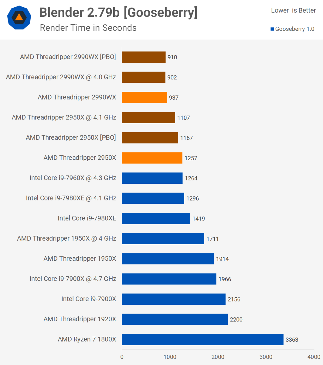 При фиксированной частоте результаты в тесте Blender лучше, но ненамного. 2950X выполнил рендеринг на 12% быстрее, 2990WX только на 4% быстрее, тогда как в Cinebench прирост был 20%.