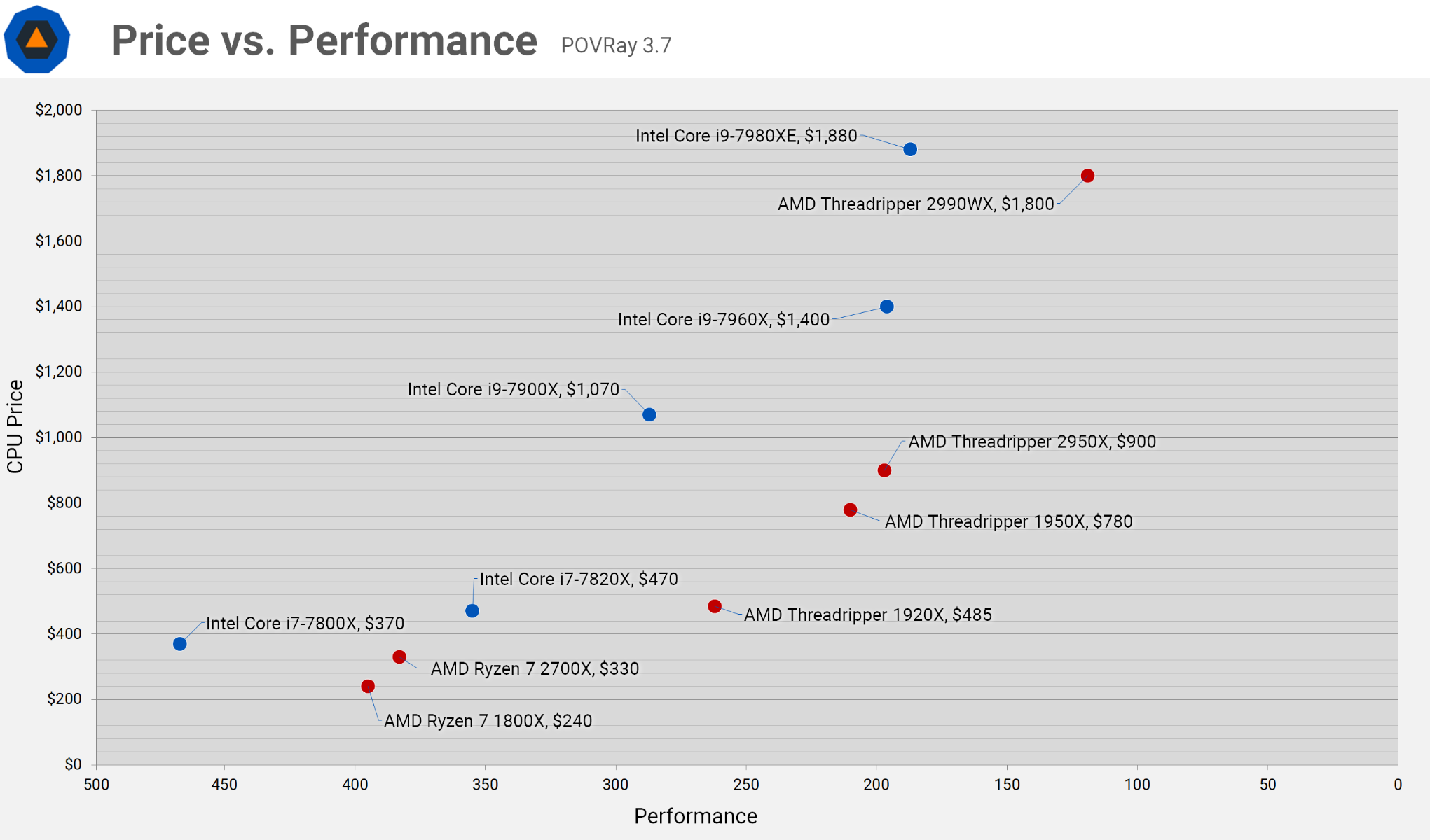 Для анализа производительности возьмём данные POVray, поскольку тут 2990WX проявляет себя лучше всего, намного опережая 7980XE при более низкой цене. Для рендеринга 2990WX подходит отлично. Пусть тут не лучшее соотношение цены и качества, но одно из лучших в верхнем сегменте.