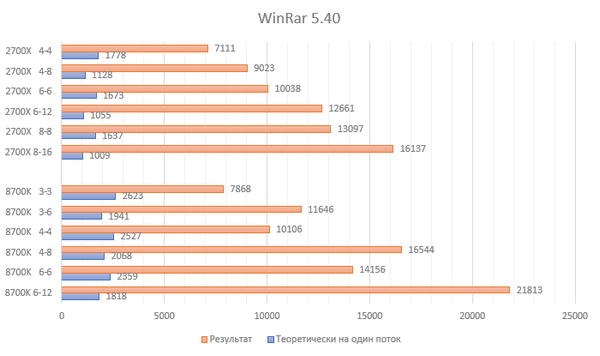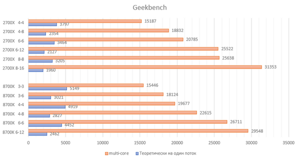 Используя матан и вычитание, видим прибавку результата у 8700K в режимах 3-6 и 6-6 относительно 3-3 в 209 и 631 балл соответственно, что даёт нам приблизительное значение эффективности логического ядра на уровне 0,33 от эффективности физического ядра. В дальнейшем именно такими вычислениями буду получать этот коэффициент. Для 2700Х аналогичные изыскания в режимах 4-4, 4-8 и 8-8 дают коэффициент 0,45, что ощутимо выше результата процессора синих. Вот и первый намёк на правдивость изначального предположения.