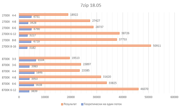 Тесты ожидаемо включают как те, где логические процессоры эффективны, так и наоборот - не очень. Коэффициенты эффективности: HT – 0,24, SMT – 0,35. Наглядно результат видно на результате 2700X в режимах 6-12 и 8-8, добавление 6 логических ядер даёт практически такую же прибавку в производительности, как и 2 физических относительно режима 6-6.