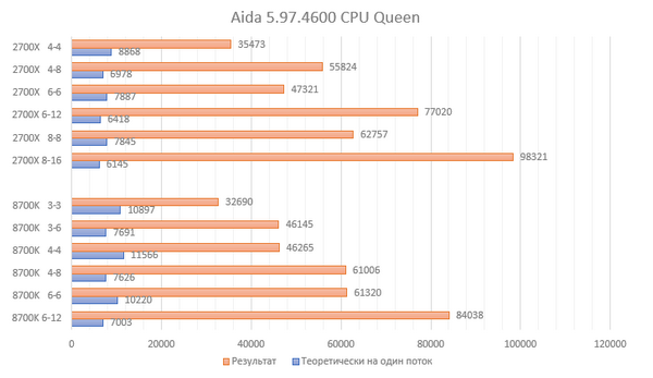 Напомню, что синим обозначены не результат теста при использовании одного ядра, а именно отношение результата к количеству потоков. Редкий случай - прекрасная масштабируемость результата.