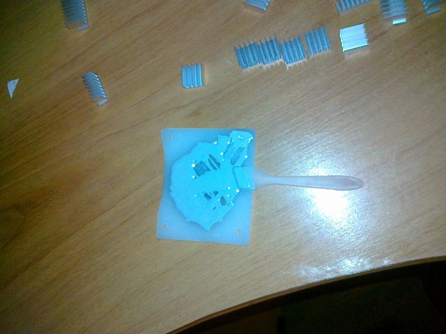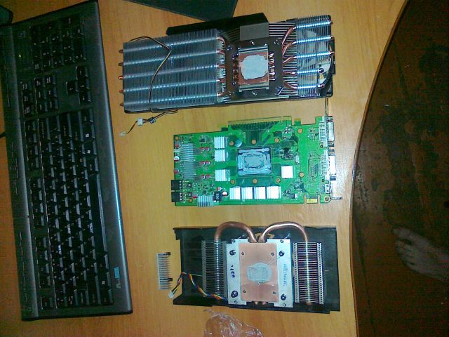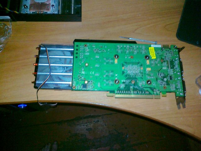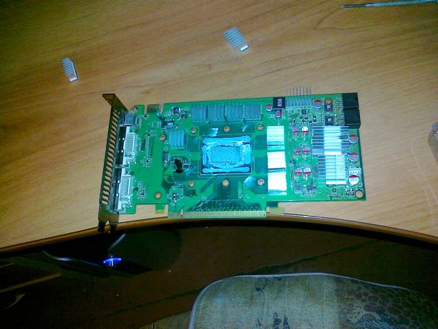 Сутра с больной головой проснулся, посмотрел на видюху, поставил временно Радеон 2900, а 460ю отдал знакомому гуру паяльника и канифоли. Через неделю зачинил таки. Делать новую прижимную пластину на голом кристалле нерешился, ставить крышку назад было влом. Подточил стойки на родном охладе и присобачил его.