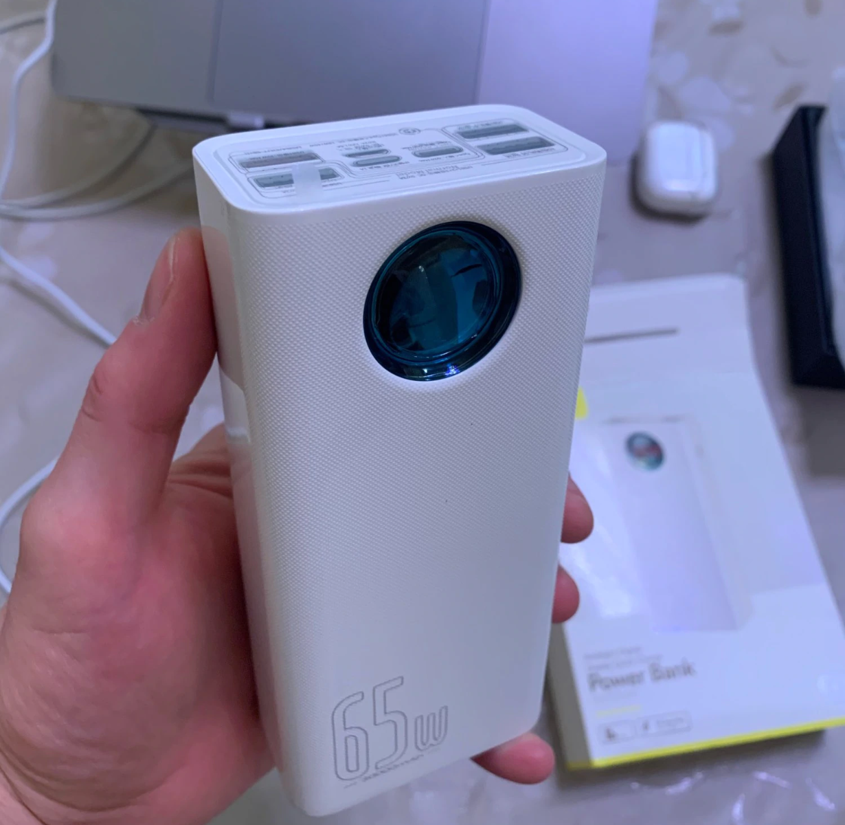 Отличный Power Bank с суммарной мощностью 65 Вт и емкостью аккумулятора 30000 мАч. С помощью данного устройства можно заряжать не только смартфон, а также планшет или даже ноутбук. Пять портов для зарядки обеспечат максимальную эффективность с большой мощностью. Круглый светодиодный дисплей отображает процент заряда, а также ток потребления с напряжением. Корпус выполнен из качественного пластика, с весом 550 гр. Возможна доставка товара с территории РФ.
