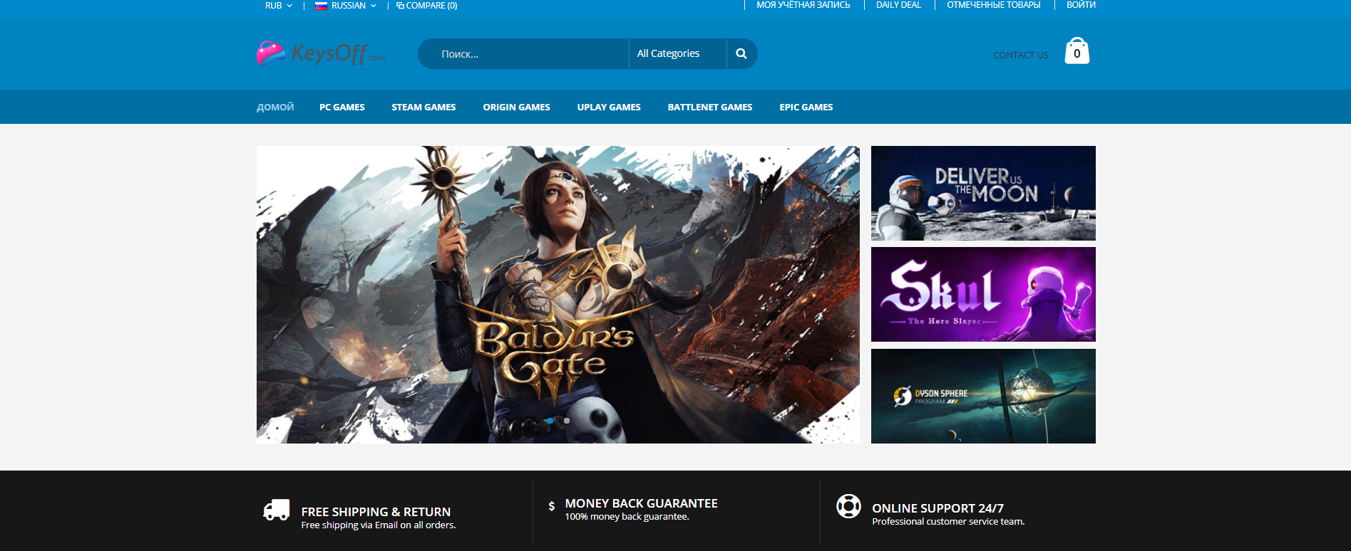 Русский язык на сайте имеется, но русификацию полной назвать нельзя. Мало того, все описания продуктов, доступных на страницах KeysOff, останется на английском. Все основные валюты тоже есть – евро, доллары, фунты стерлингов. Рубли то же есть, однако, в списке они отсутствуют по умолчанию. Чтобы появилась российская валюта, нужно перейти на русский язык. После этого все цены автоматически будут указываться в рублях.