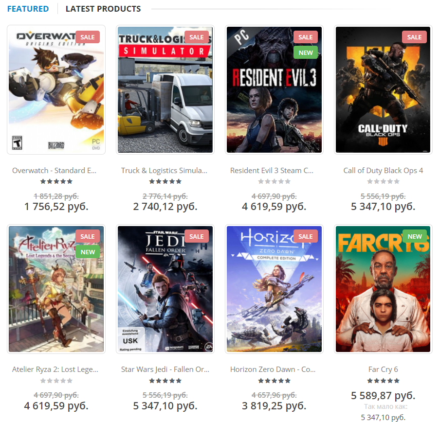 Ещё ниже видим несколько предложений. Например, Overwatch примерно за 1800 рублей или Truck & Logistics Simulator за 2740 рублей. Также на главной странице есть Call of Duty Black Ops 4 стоимостью около 5350 рублей, Resident Evil 3 за 4620 рублей, Far Cry 6 по цене 5590 рублей и ещё несколько предложений. Детальнее об ассортименте поговорим в следующем разделе.
