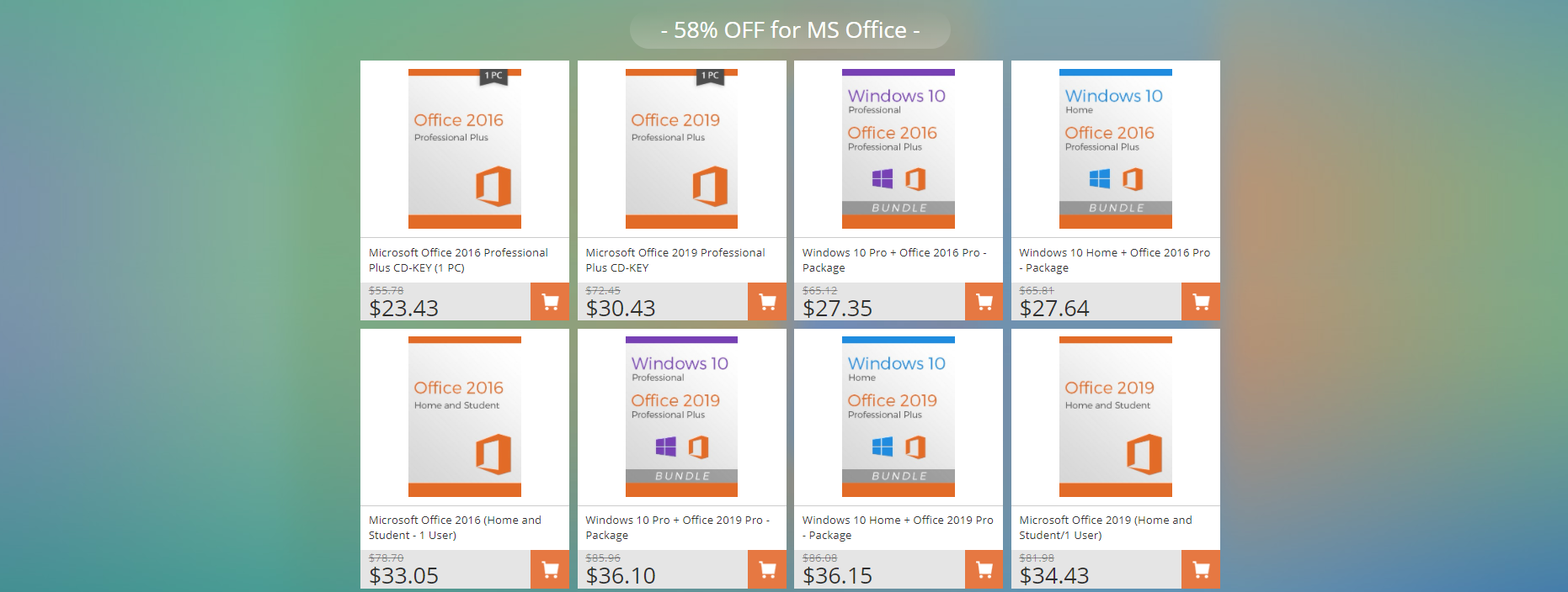 Магазин предлагает офисные программы в рамках пакетов MS Office 2016 и 2019 Professional Plus. Стоимость программного обеспечения по акции с учётом скидки составляет примерно 1790 рублей и 2325 рублей соответственно.