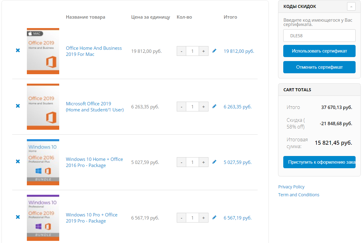 В сумме за четыре позиции мы получаем 37 670,13 руб. Переходим к корзине и вводим промокод DLE58. С его помощью получает скидку в размере почти 22 000 рублей. Итоговая сумма заказа составит 15 821,45 руб., вместо 37 670,13 руб. Минус заключается в том, что система не указывает только размер общей скидки.
