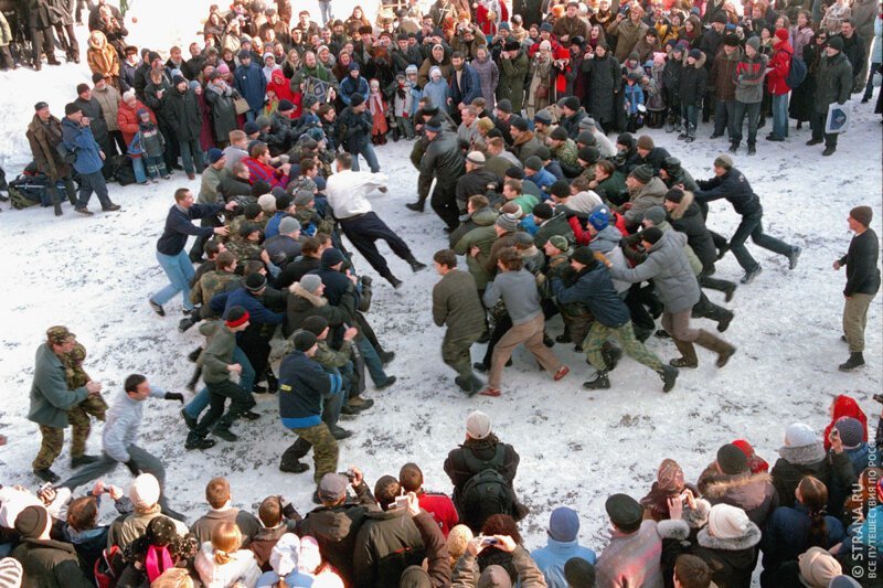 Народ предавался всевозможным потехам, кулачные бои, устраивались катания на санях, разные соревнования, а под вечер устраивали обильные застолья. Главное действие в четверг — штурм и дальнейший захват снежного городка