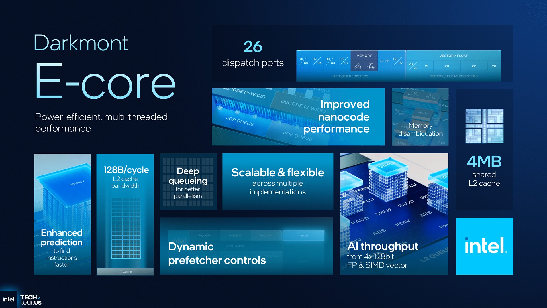 Обновление E-ядер выглядит более значительным. Они основаны на архитектуре Darkmont, которая должна быть заметно лучше Crestmont. В частности, буфер внеочередного исполнения увеличился до 416 записей. Кластер ядер оснащается быстрым кэшем 2-го уровня объёмом 4 МБ. Прирост IPC не уточняется, но для серверных процессоров Clearwater Forest, где тоже используются ядра Darkmont, в Intel заявили о 17-процентном преимуществе относительно ядер Crestmont. На каждое E-ядро приходится 96 КБ кэша 1-го уровня. Ядра P и E также делят кэш 3-го уровня общим объёмом до 18 МБ.