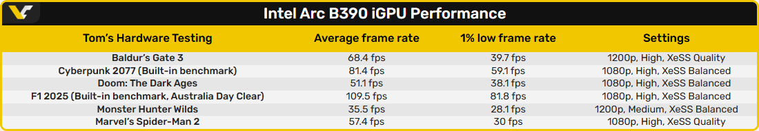 В ходе тестирования Tom's Hardware использовалось разрешение 1080p или 1200p с масштабированием XeSS. Представители Intel подтвердили, что предельная мощность процессора Core Ultra X9 388H составляет 65 Вт в режиме PL1 с кратковременным повышением до 85 Вт в режиме PL2. По итогам короткой тестовой сессии были получены следующие результаты.