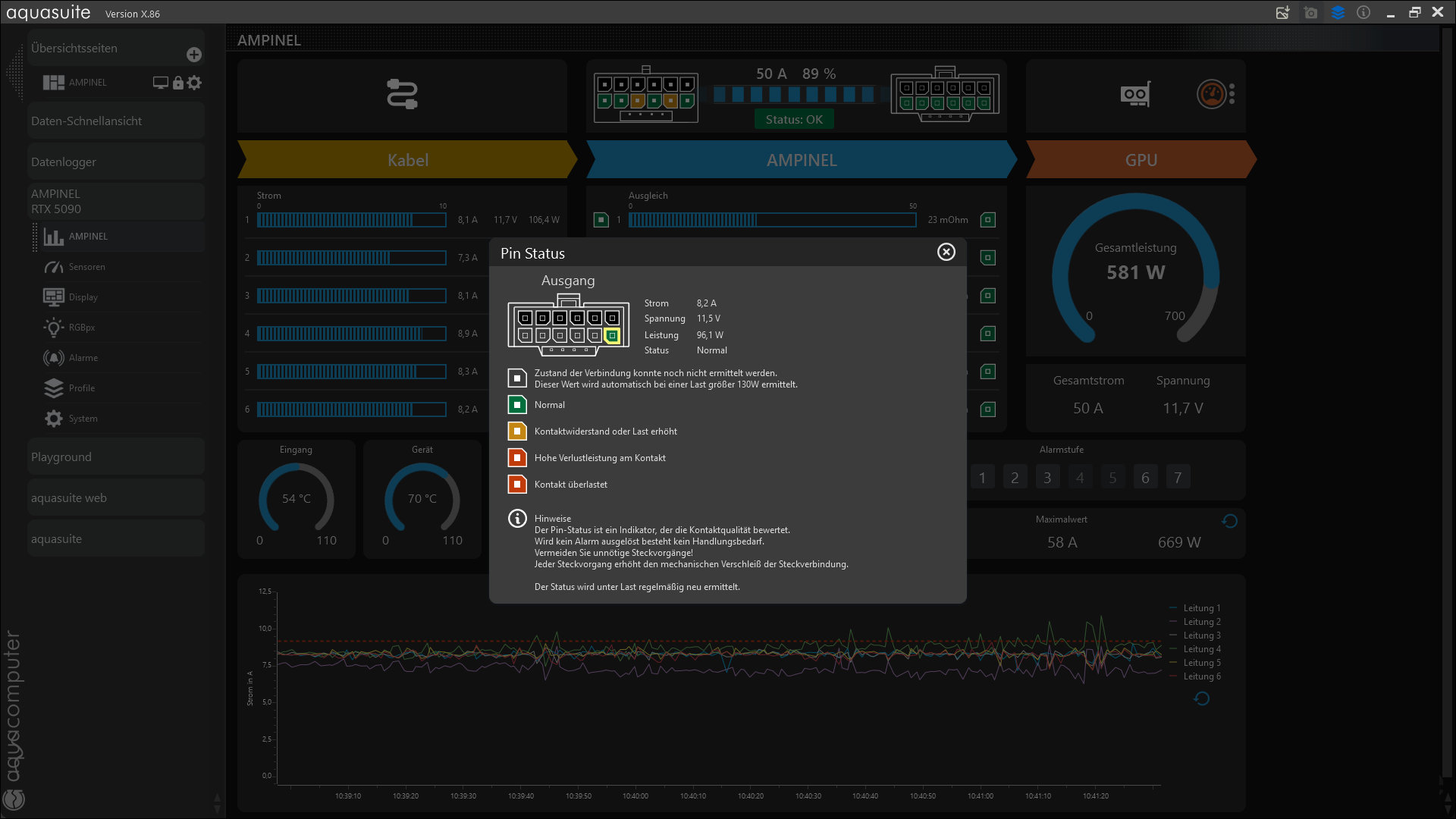 Устройство позволяет детально настраивать функции защиты, в т.ч. срабатывание ограничений и уведомление пользователя о происходящем. Можно компенсировать неравномерность тока на отдельных 12-вольтовых контактах кабеля 12V-2x6. Балансировку нагрузки Ampinel можно настроить и, при желании, полностью отключить. Эту функцию авторы ComputerBase записали в преимущества Ampinel, сравнивая устройство с альтернативным решением WireView Pro II от Thermal Grizzly, но тут же отметили и недостаток — отсутствие такой же расширенной гарантии, которая в определённых случаях кроме самого устройства распространяется и на видеокарту.
