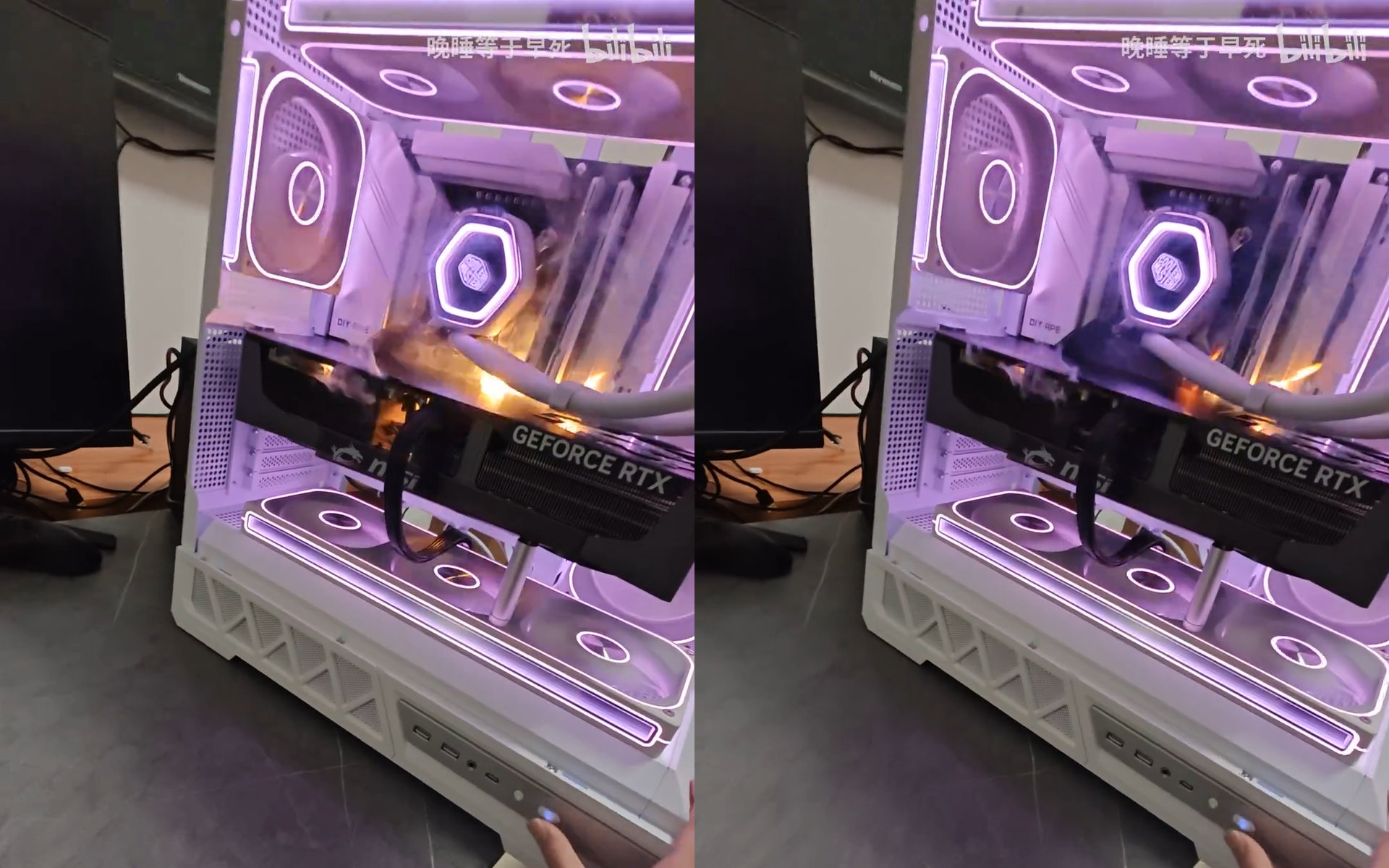 Пользователь Bilibili запечатлел на видео момент возгорания видеокарты GeForce RTX 5090 во время первого запуска. Как объясняет автор, видеофиксация выполнялась по итогу модернизации компьютера, замены блока питания и видеокарты. Ожидалось, что система успешно запустится, после чего компьютер вернётся в работу, однако RTX 5090 «поджарилась» сразу же после нажатия на кнопку питания системного блока. Несколько мгновений можно было наблюдать открытое пламя.