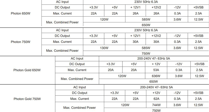 Обе серии включают по две модели: на 650 и 750 Вт. Блоки питания Photon имеют размеры 140 x 150 x 87 мм и оснащены 120-мм вентилятором, Photon Gold — 160 x 150 x 87 мм и 140 мм вентилятором.