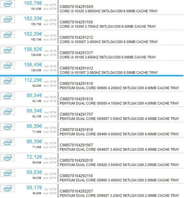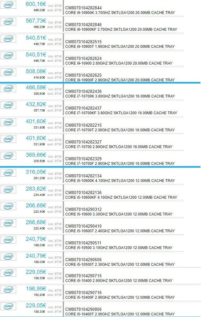 Китайский компьютерный портал HKEPC опубликовал информацию о стоимости грядущих настольных процессоров Intel Comet Lake-S. Несколько дней назад информация о технических характеристиках процессоров Intel 10-го поколения утекла в сеть. В утечке были обнародованы слайды из еще несостоявшейся презентации компании. Нас ожидает линейка из 17 новых Core процессоров с количеством ядер от 4 до 10, при этом все процессоры будут поддерживать технологию Hyper Threading, а максимальные частоты флагманских моделей будут достигать 5,3-4,8 ГГц. Ожидаются также пять процессоров в линейке Pentium G и три процессора в линейке Celeron G. Некоторые зарубежные интернет-магазины уже делают возможным оформление предварительного заказа на новые процессоры, так десятиядерный i9-10900K обойдется покупателям в 597€, i7-10700K - 462€, i5-10600K - 314€, i3-10300 - 181€, за новые Pentium G просят в среднем около 100€, а за Celeron G 60€.
