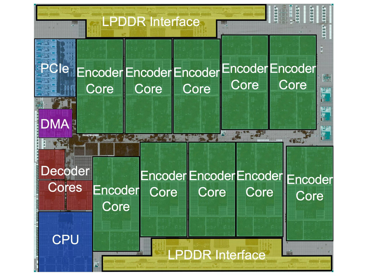 Структура чипа Argos включает контроллеры ввода-вывода и памяти, процессор, управляющий распределением потоков данных и, самое главное, десять ядер для перекодирования, каждое из которых способно обрабатывать видео в разрешении 2160p со скоростью 60 кадров в секунду.