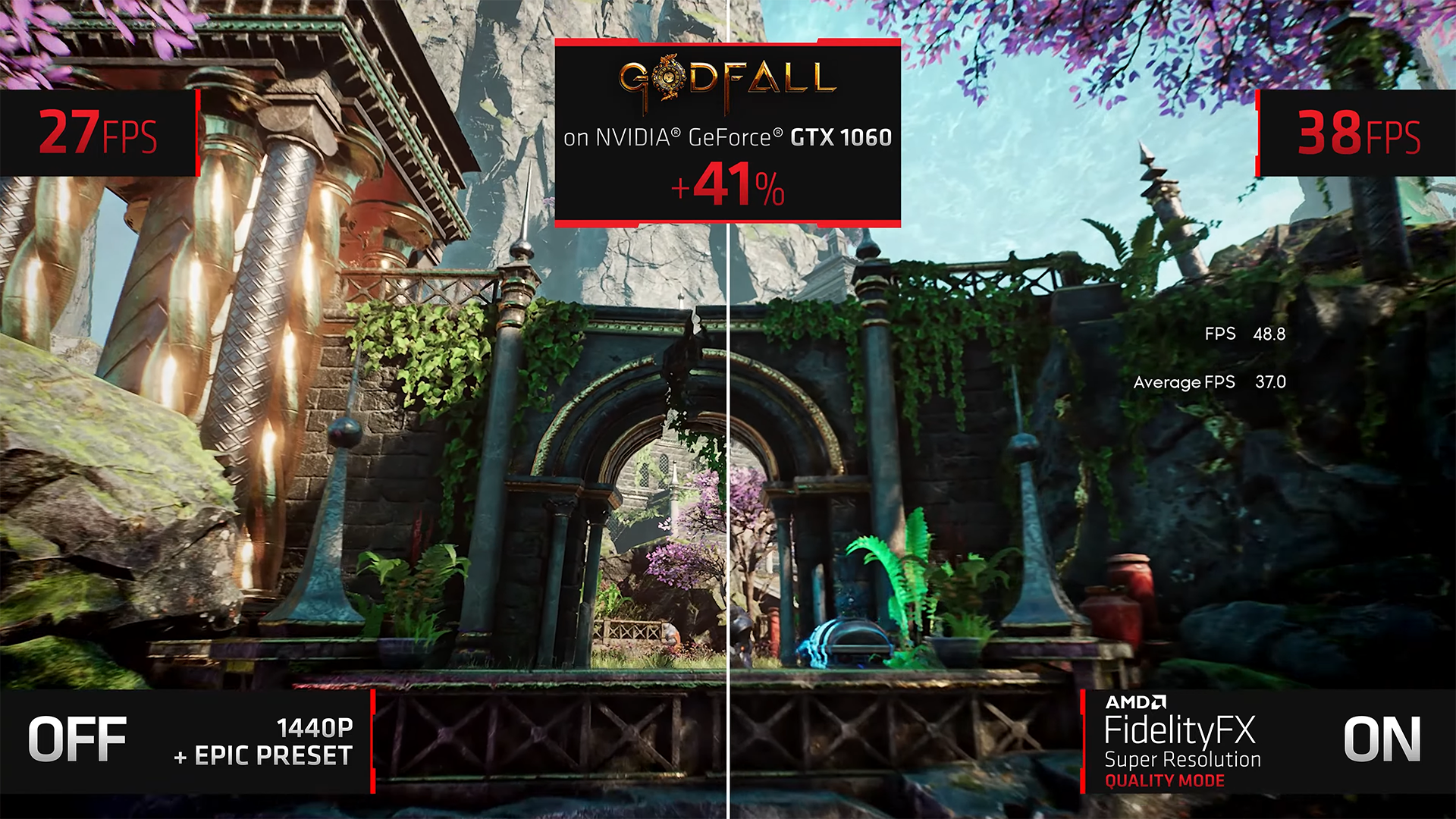 Один из ключевых моментов — долгожданный анонс Fidelity FX Super Resolution. В Godfall технология масштабирования обеспечила для RX 6800 XT прирост производительности 59% в режиме Ultra Quality, по сравнению с нативным 4K разрешением. В режиме Performance прирост составляет 300%. Технология станет доступна 22 июня для видеокарт RX серий 6000, 5000, 500, Vega, встроенной графики, а также видеокарт NVIDIA, начиная с поколения Pascal.