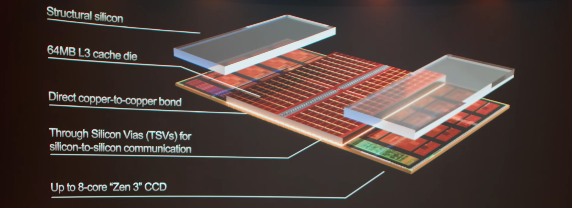 Вторым ключевым моментом является премьера трехмерной компоновки для процессоров Ryzen. Впервые технология будет использована для надстройки на чиплеты ядер (Core Complex Die, CCD) дополнительных 64 МБ 7-нм SRAM кеша с пропускной способностью более 2 ТБ/с. Каждый 8-ядерный CCD теперь может содержать в общей совокупности до 96 МБ L3-кеша. AMD показала прототип Ryzen 7 5950X, построенный с применением этой технологии, и протестировала его в Gears 5, где прирост производительности составил 12%. Больше информации о процессорах с трехмерной компоновкой станет доступно к концу года, вероятно, с анонсом новой серии.
