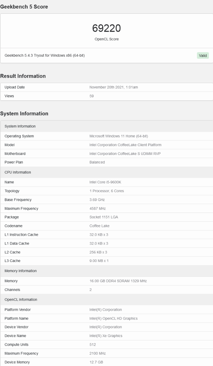 В базе данных Geekbench в очередной раз отметился флагманский вариант дискретной настольной видеокарты Intel Arc Alchemist. Модель, оснащенная графическим процессором с 512 исполнительными блоками (Execution Units, EU), улучшила свои результаты. В OpenCL бенчмарке общая оценка составила 69220 баллов, что совпадает с усредненными по всей базе результатами NVIDIA GeForce RTX 2060, в сентябре результат этой модели, правда для ноутбуков, составлял около 34000 баллов. Очевидно, что все возможности видеокарты еще не раскрыты. В данном тестировании графический процессор мог работать не на пиковой частоте, во время тестирования она держалась на уровне 1,3 ГГц при максимальном значении 2,1 ГГц.