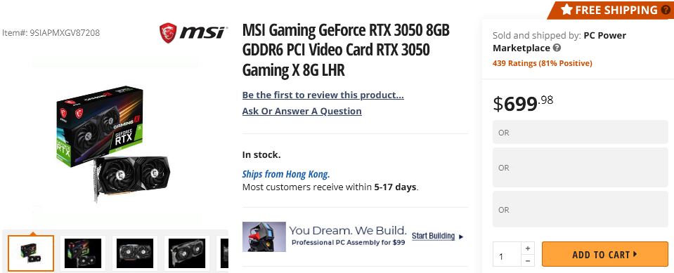 Ресурс VideoCardz также обнаружил MSI Gaming GeForce RTX 3050 на торговой площадке Newegg и в данном случае цена модели 699 долларов США, эта цена может быть просто «заглушкой», отмечает ресурс, но есть опасения, что на старте она действительно может достичь таких значений. Даже если так, можно надеяться на ее снижение — курс криптовалют снижается, в майнинге GeForce RTX 3050 выглядит очень слабой, а по слухам из Китая, поставки этой модели могут быть больше, чем других вариантов.