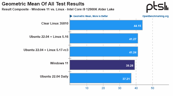 Ресурс провёл тестирование Intel Core i9-12900K в 104 сценариях. С Windows 11 соревновались «ежедневная» сборка Ubuntu 22.04 LTS на базе ядра Linux 5.15, её варианты с ядрами 5.16 и 5.17-rc3, а также дистрибутив Intel — «плавающий» выпуск Clear Linux 35810 с ядром 5.16. В среднем Ubuntu Linux 5.16 и 5.17-rc3 примерно на 5% быстрее Windows 11, а дистрибутив Clear Linux и вовсе на 12,3%, он занял первое место в 66 тестах. Также в общей совокупности Ubuntu Linux 5.16 и 5.17-rc3 занимает первое место в 19 тестах, а Windows 11 только в 14. Если говорить о старой версии ядра, то Ubuntu Linux 5.15 заняла последнее место в 56 тестах — преимущество новых сборок очевидно.